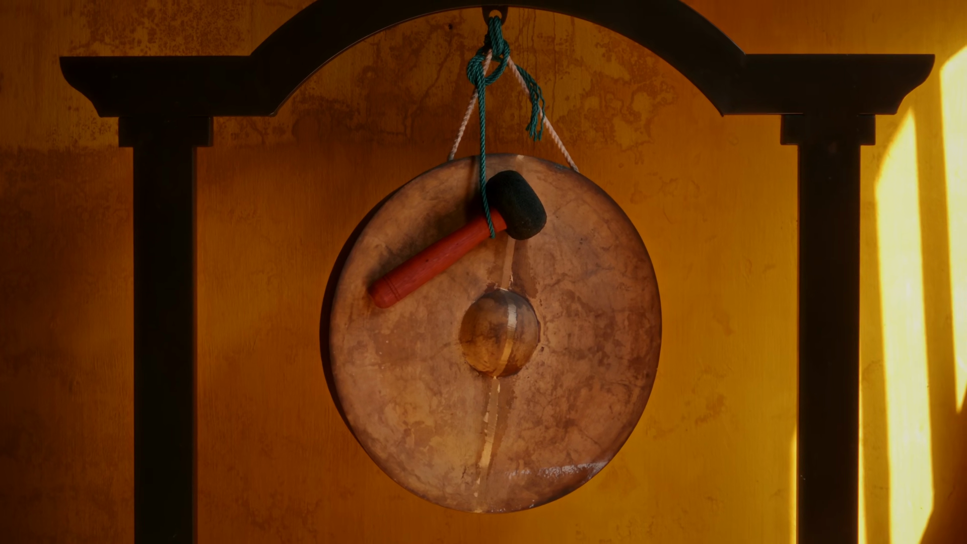 Traditional Gong On Wooden Stand Against Yellow WallÂ