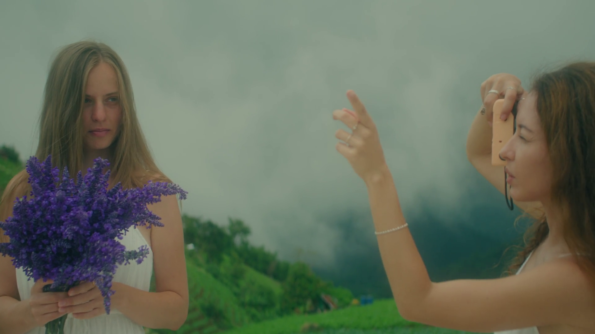 Two Young Girls In White Dresses Are Photographed On Top Of A MountainÂ