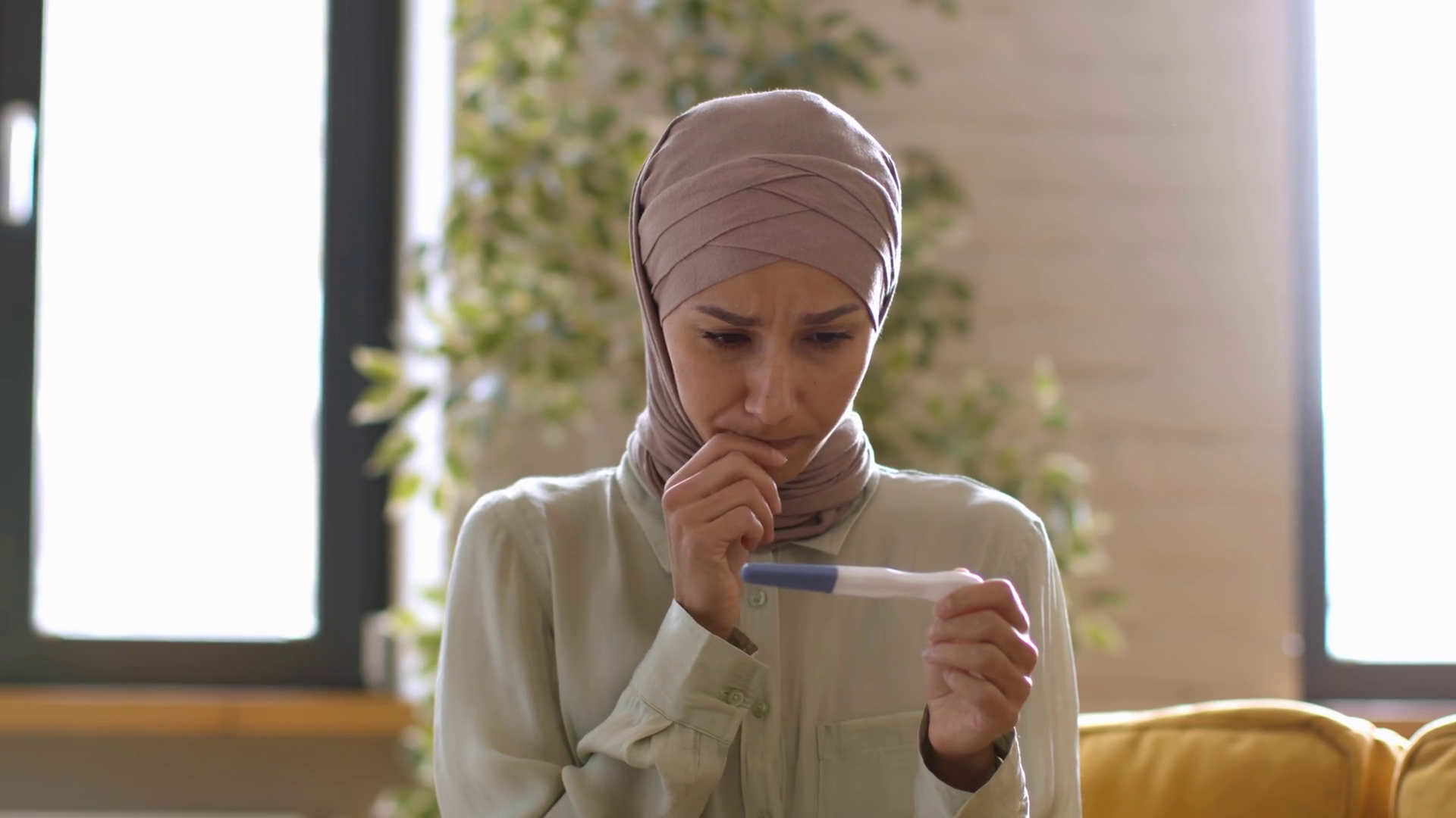 Surprising Pregnancy Concerned Young Woman In Hijab At Home With Pregnancy Test Tracking Shot Open AreaÂ