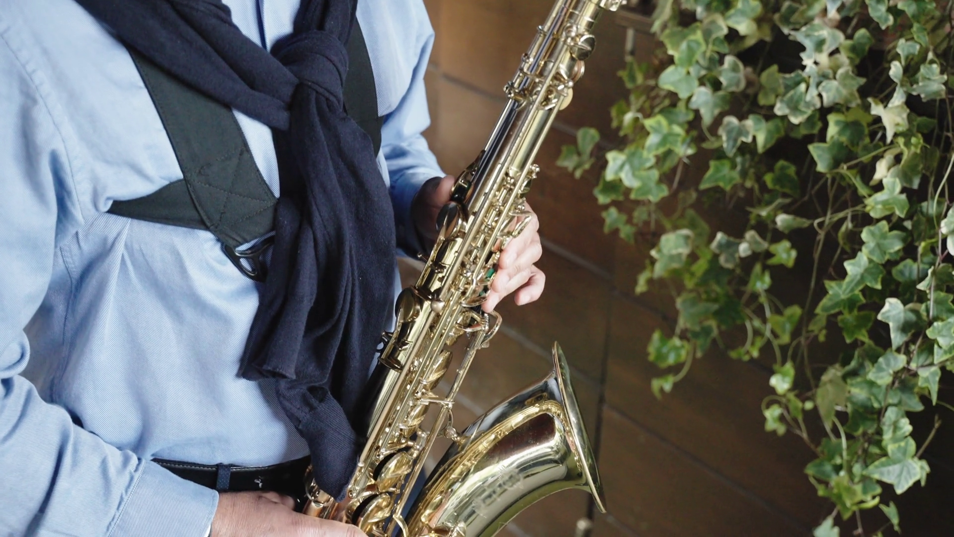 Unrecognisable Musician Play The Saxophone In Restaurant Club Bar Or Luxury Hotel Golden Musical Instrument In Hands Of Professional