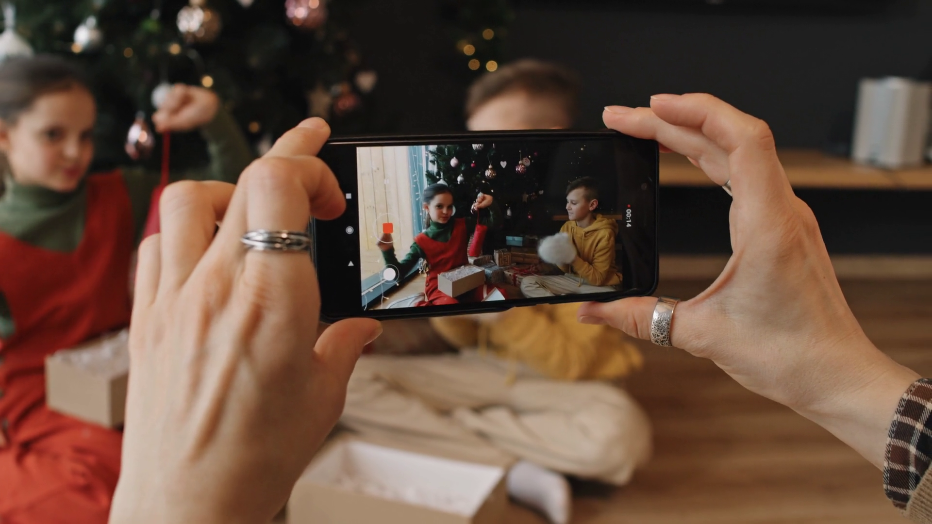 Unrecognizable Female Hands Holding Smartphone Recording Video Of Two Cheerful Siblings Unwrapping Christmas Presents And Having Fun Sitting Under Christmas Tree In Cozy Decorated Living RoomÂ