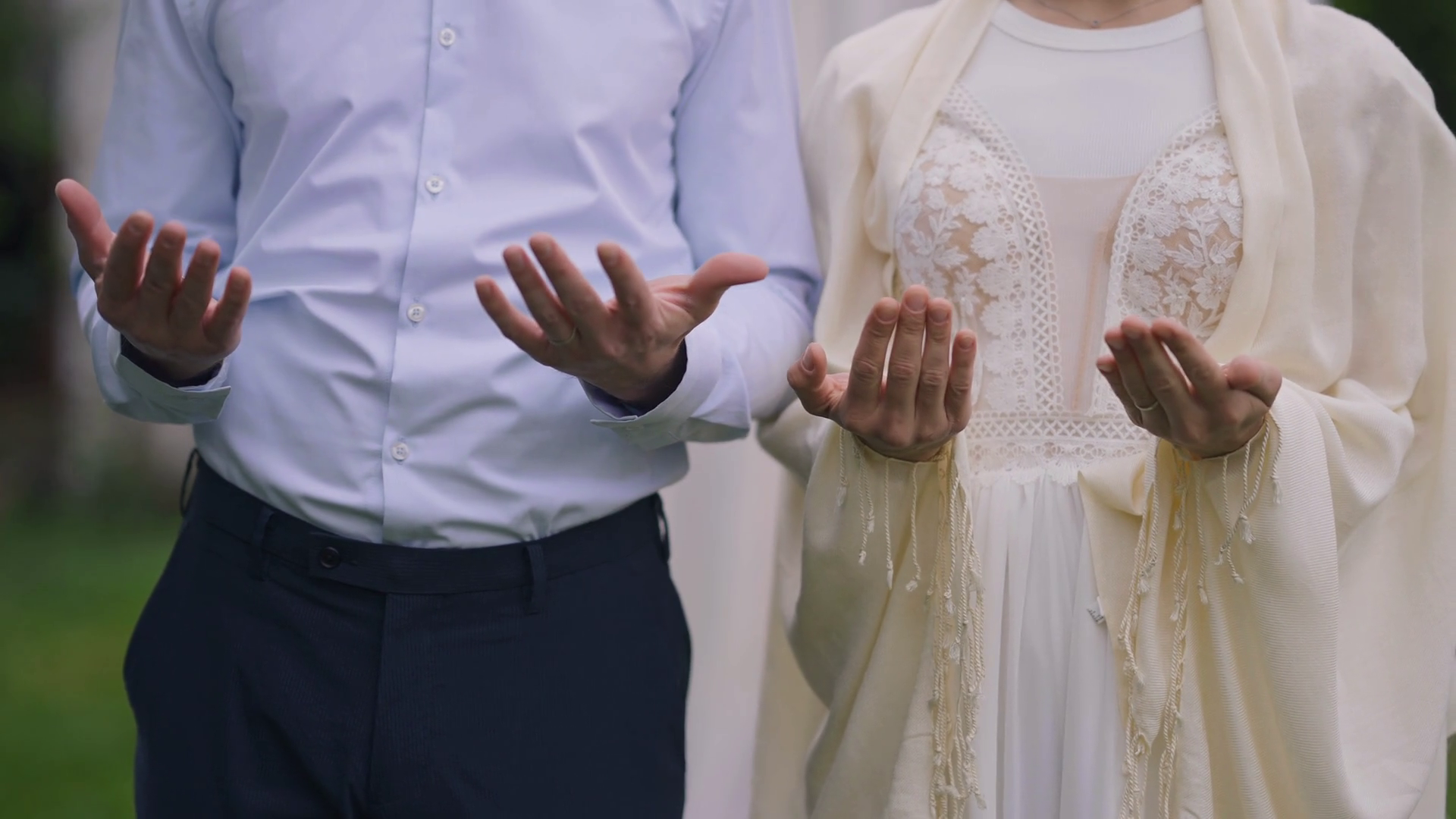 Muslim Couple Praying Outdoors In A Garden Young Woman And Man Holding Hands In Marriage Ceremony Wedding And ReligionÂ