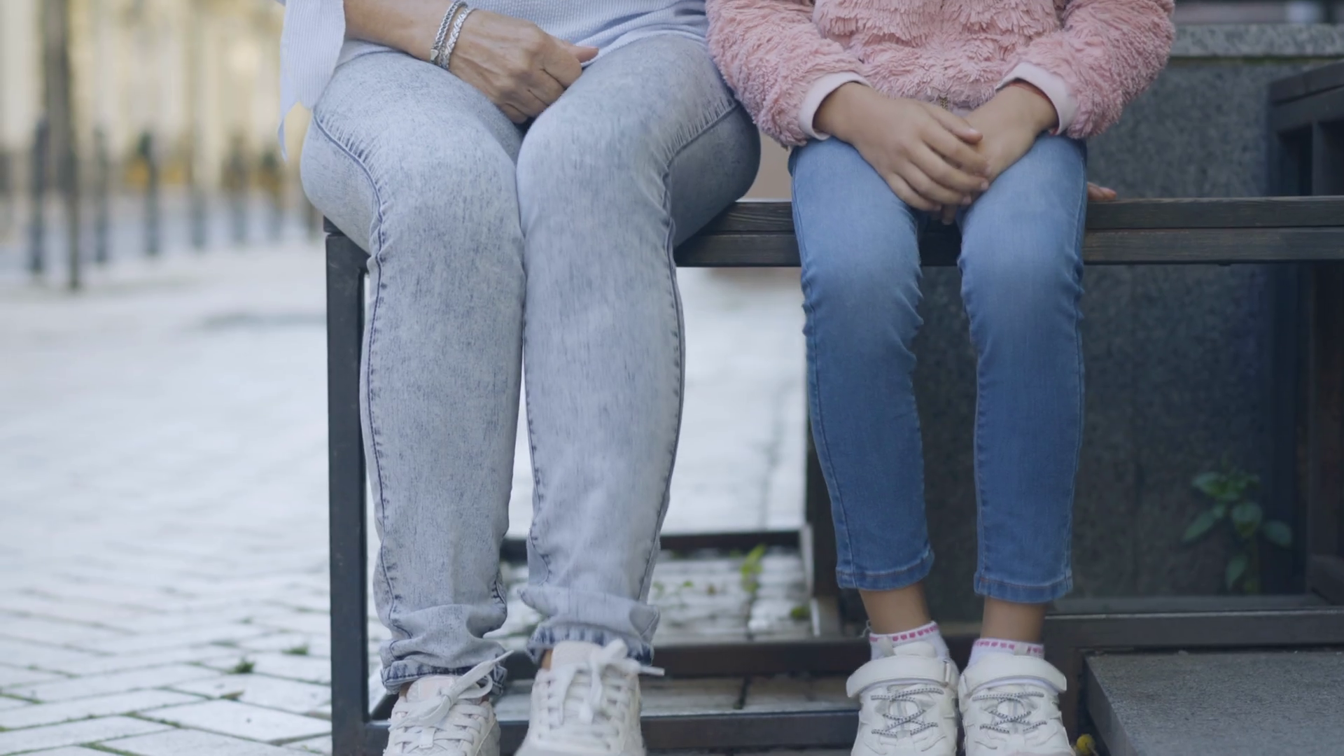 Unrecognizable Woman And Girl In Casual Jeans And Sneakers Crossing Legs Sitting On City Street Happy Relaxed Mother And Daughter Or Grandmother And Granddaughter OutdoorsÂ