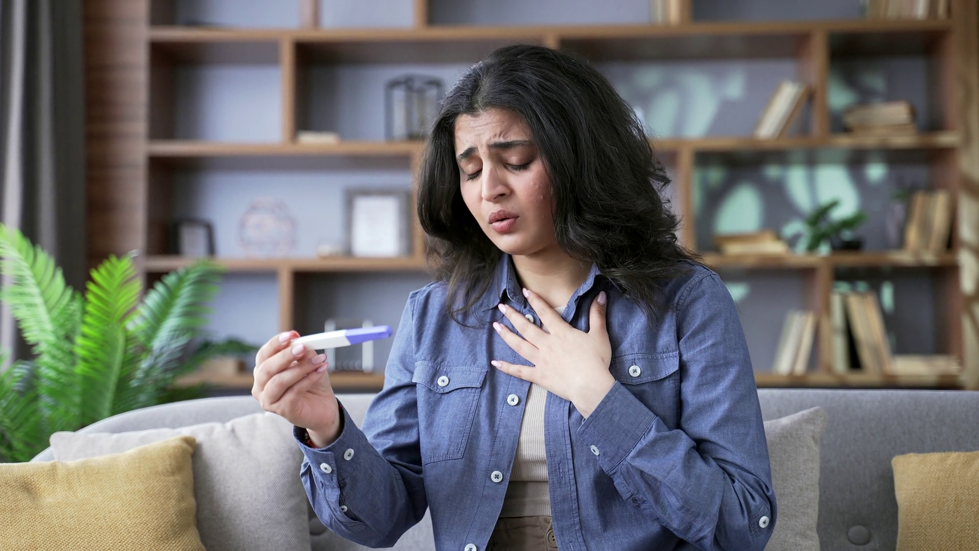 Upset Young Woman Is Holding In Her Hands A Pregnancy Test With A Negative Result While Sitting On The Sofa In The Living Room At Home Disappointed Upset Female Dissatisfied And Depressed Close UpÂ