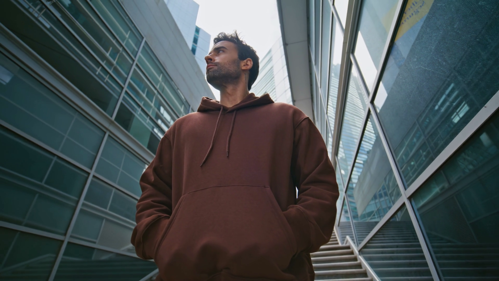 Urban Guy Posing Downtown Area Low Angle Athletic Man Dreaming Thinking Future Ambition And Aspirations Casual City Explorer ConceptÂ