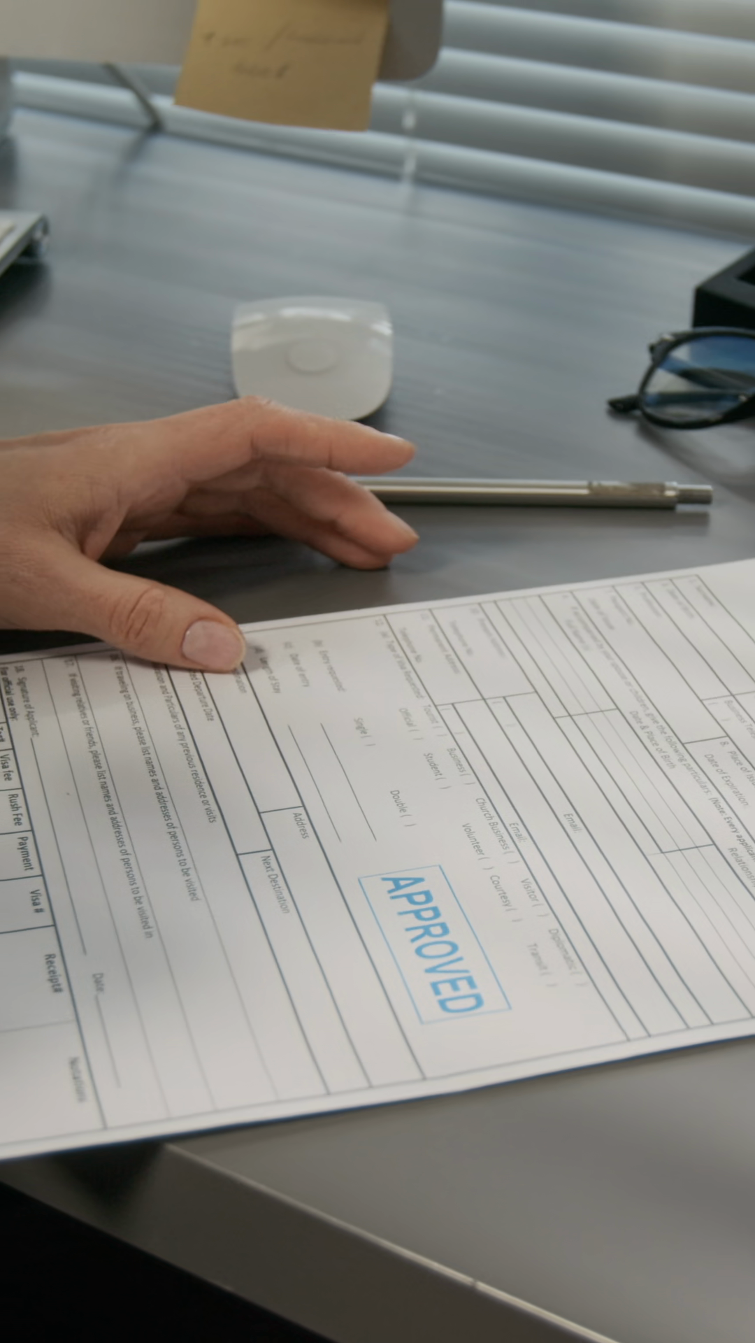 Vertical Closeup Of Hand Of Anonymous Female Consular Officer Authorizing Visa Application With Blue Approval Stamp While Working At Government Diplomatic FacilityÂ