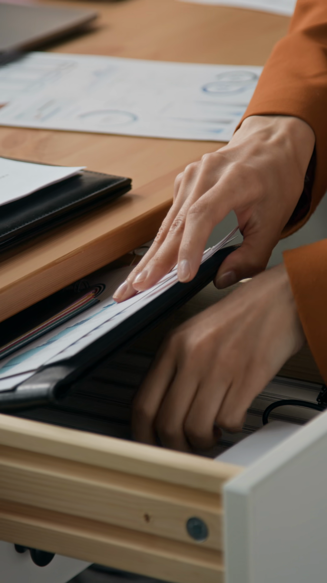 Vertical Close Up Of Unrecognizable Office Worker Tapping Pen On Wooden Desk While Handling Documents And Paperwork At Workplace During Focused Office TaskÂ
