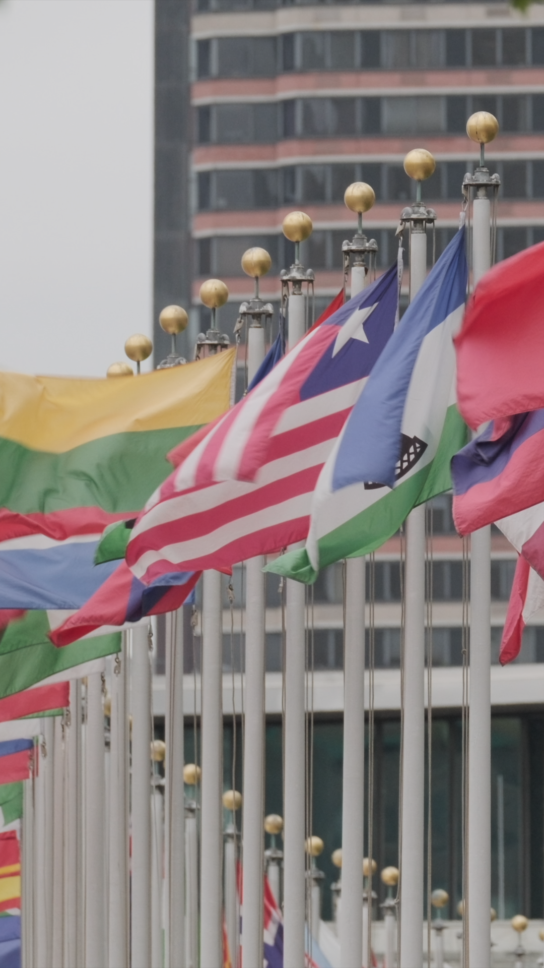 Vertical Line Of National Flags Waving In Front Of The United Nations Headquarters In New York CityÂ