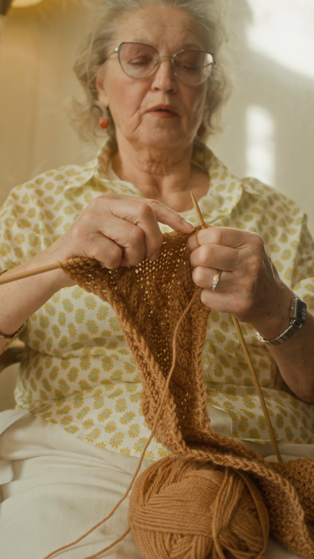 Vertical Medium Shot Of Focused Elderly Woman With Glasses Knitting Warm Wool Scarf With Needles Enjoying Quiet Moment At HomeÂ