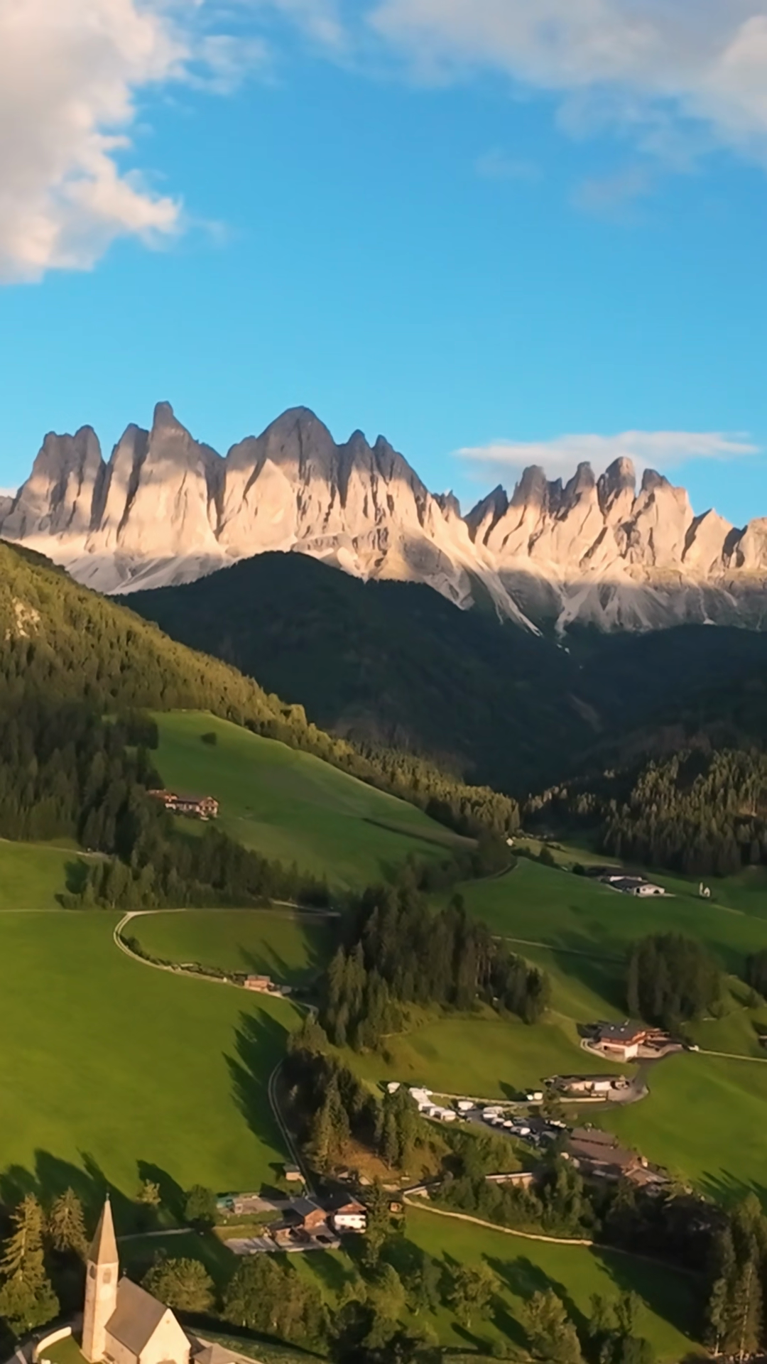 Vertical Screen Panoramic Jagged Peaks Lit By Warm Light Expansive Valley Below Winding Trail Church Spire Frames Epic Alpine Vista IdealÂ