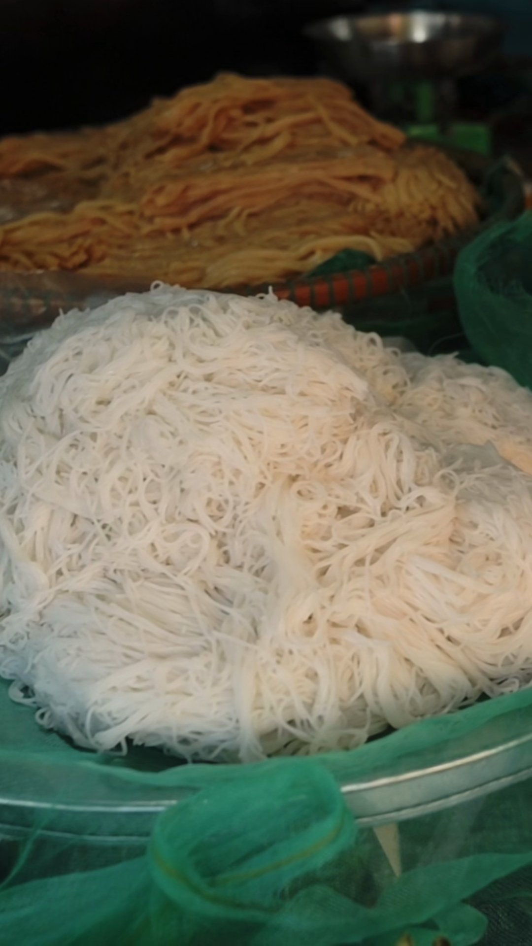 Vertical Screen White Rice Noodles Piled In Vietnam Street Market Stall With Basket Of Thin Vermicelli Green Netting Dried Noodles LayeredÂ