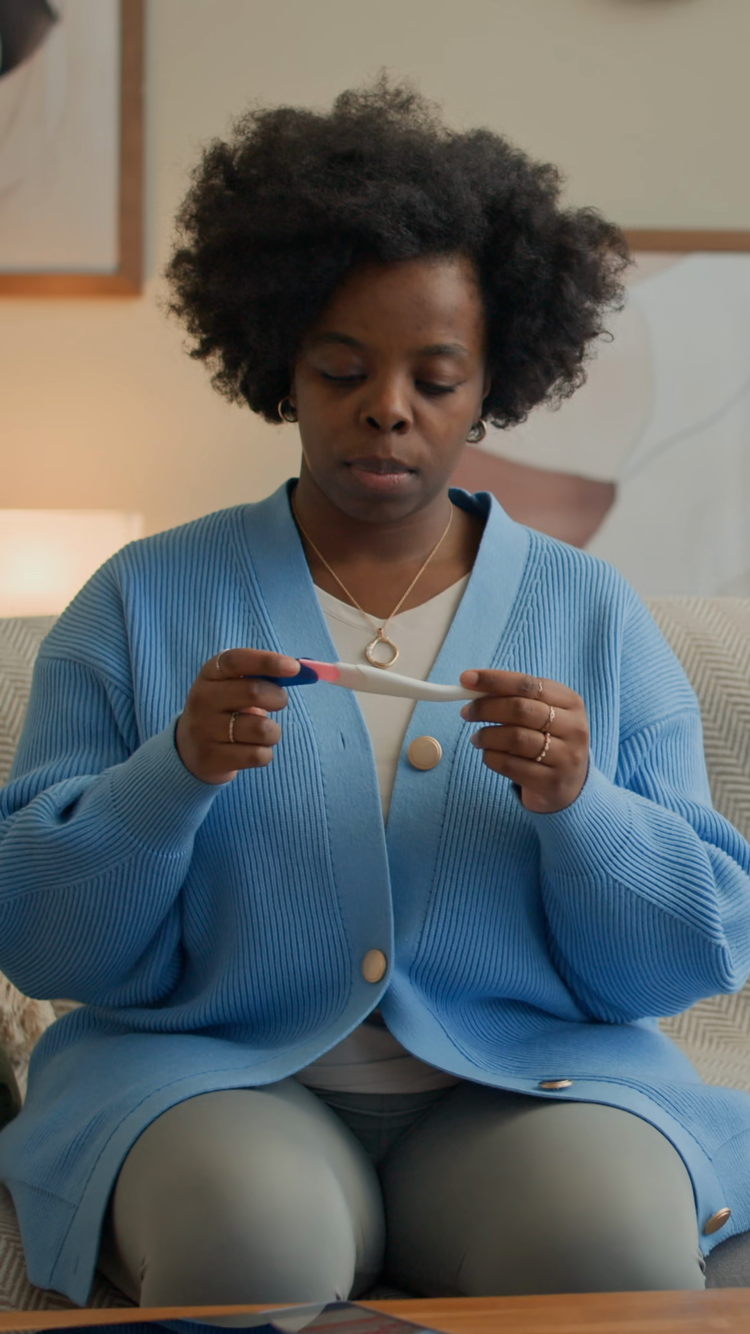 Vertical Shot Of Young Adult African American Woman Sitting On Sofa Checking Result Of Pregnancy Test And Using Mobile Phone At HomeÂ