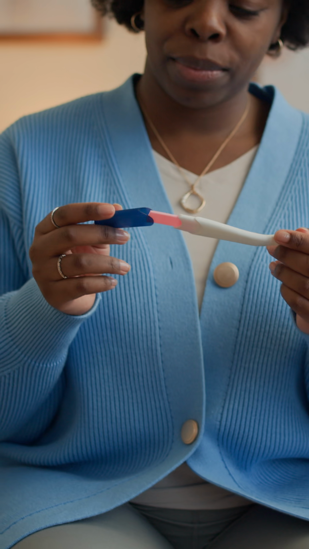 Vertical Shot Of Young African American Woman Holding Pregnancy Test And Using Smartphone In Living RoomÂ