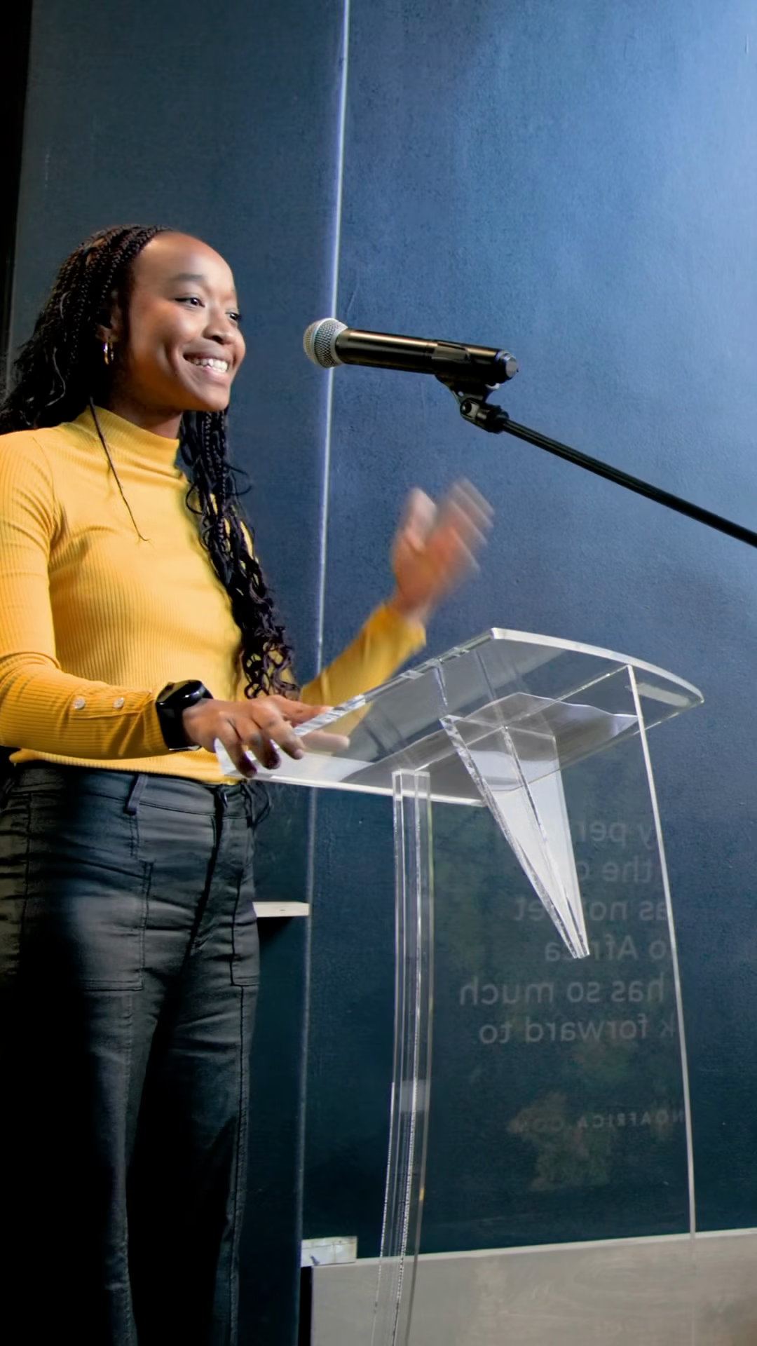 Vertical Video African American Woman Presenting At Lectern Colleague Handing Device Raising RodÂ