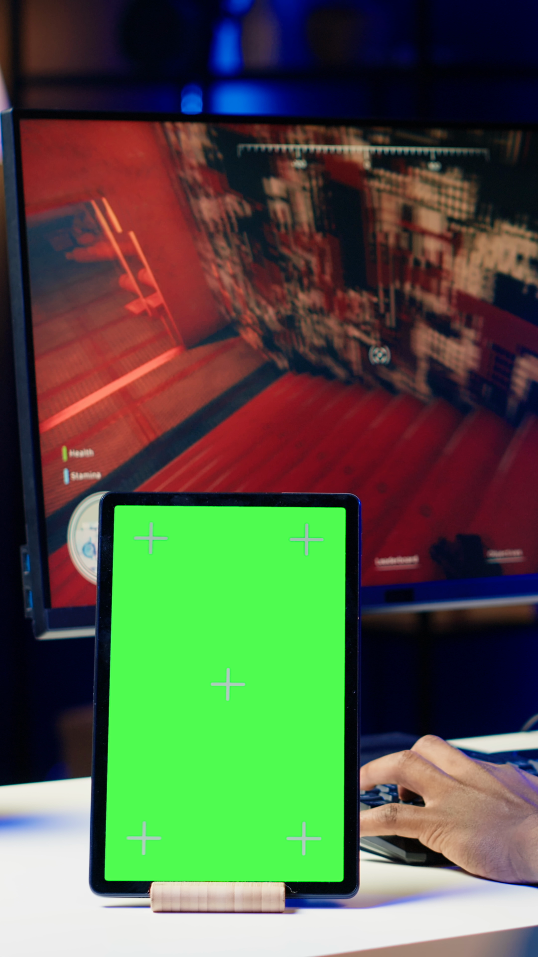 Vertical Video Chroma Key Tablet Next To Man Playing High Fps Singleplayer Videogame With Spaceship Shooting Lasers Green Screen DeviceÂ