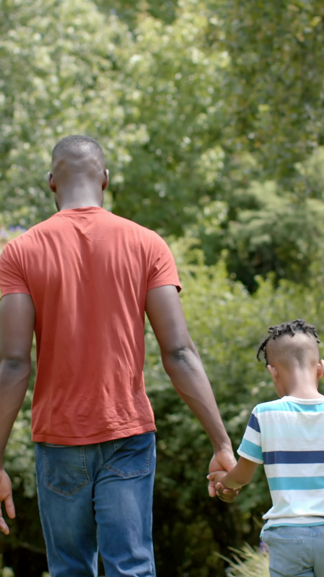Vertical Video Entering Grassy Path African American Father And Son Exploring Garden Past PlanterÂ