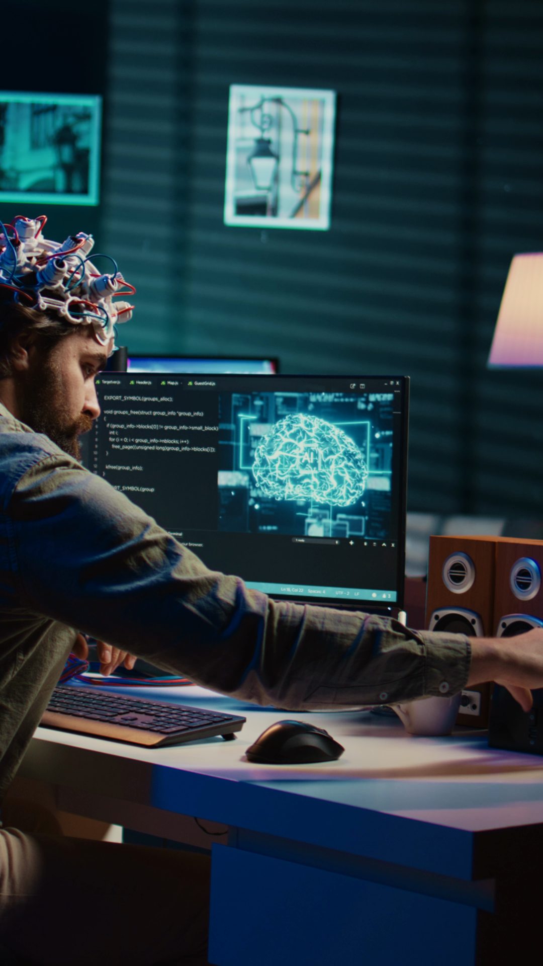 Vertical Video It Specialist Using Eeg Headset And Deep Learning Technology To Upload Brain Into Computer Close Up Of NeuroscientificÂ