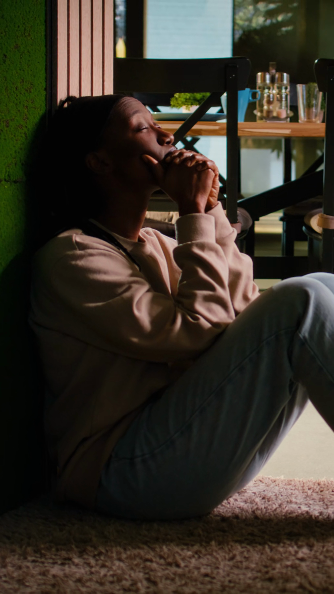 Vertical Video Lonely Depressed Woman Overwhelmed By Problems And Disappointment Sitting On The Floor In Darkness At Home And Dealing With