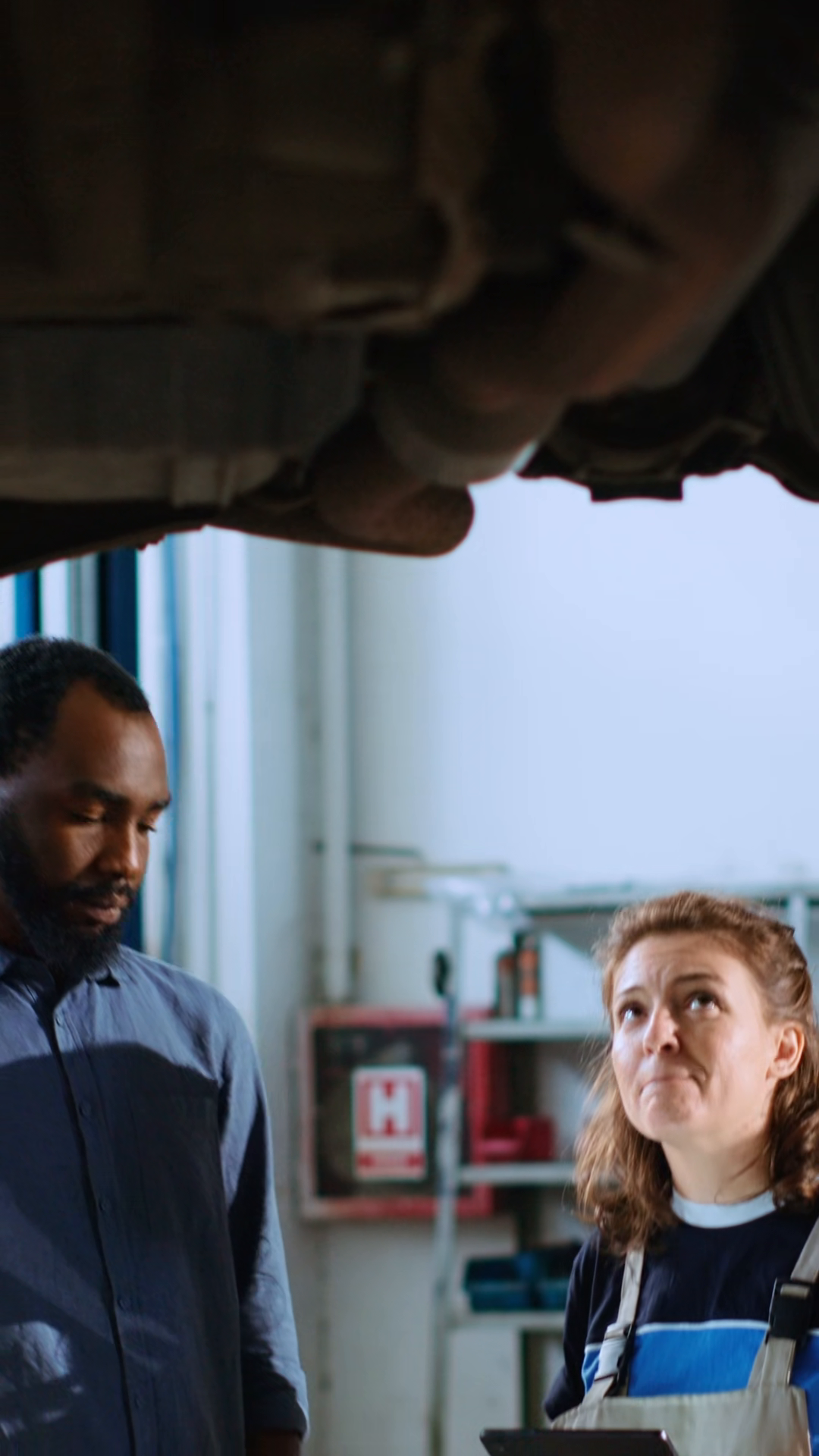 Vertical Video Meticulous Technician In Garage Workplace Stands With Customer Underneath Suspended Car Looking Together For ReplacementÂ