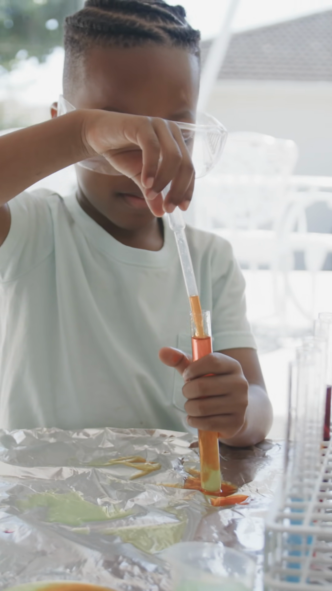 Vertical Video Picking Dropper African American Boy Mixing In Test Tube On Patio Exploring ColorÂ