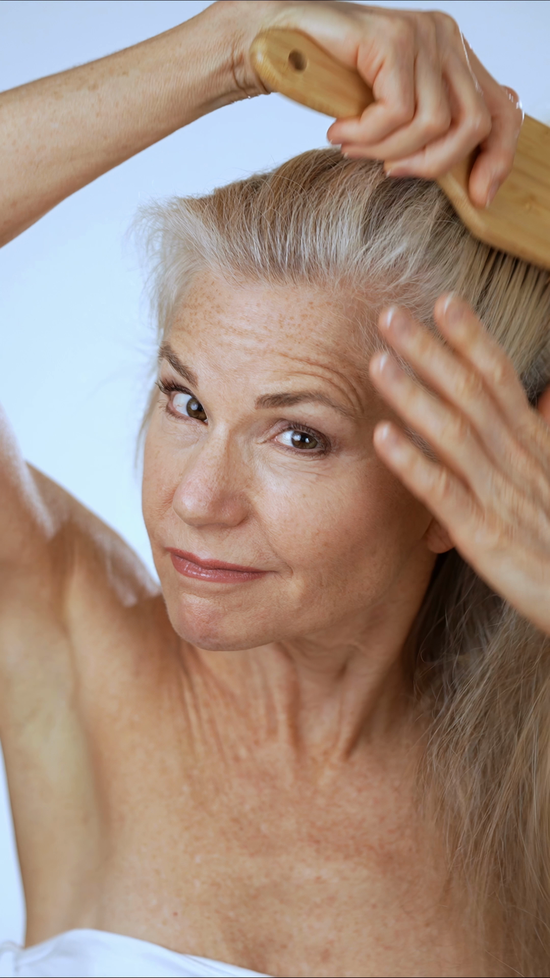 Vertical Video Portrait Of Happy Smiling Attractive Mature Woman Putting Hand On Shoulder Touching Skin Looking At Camera Advertising Of Body Care Spa Procedures ConceptÂ