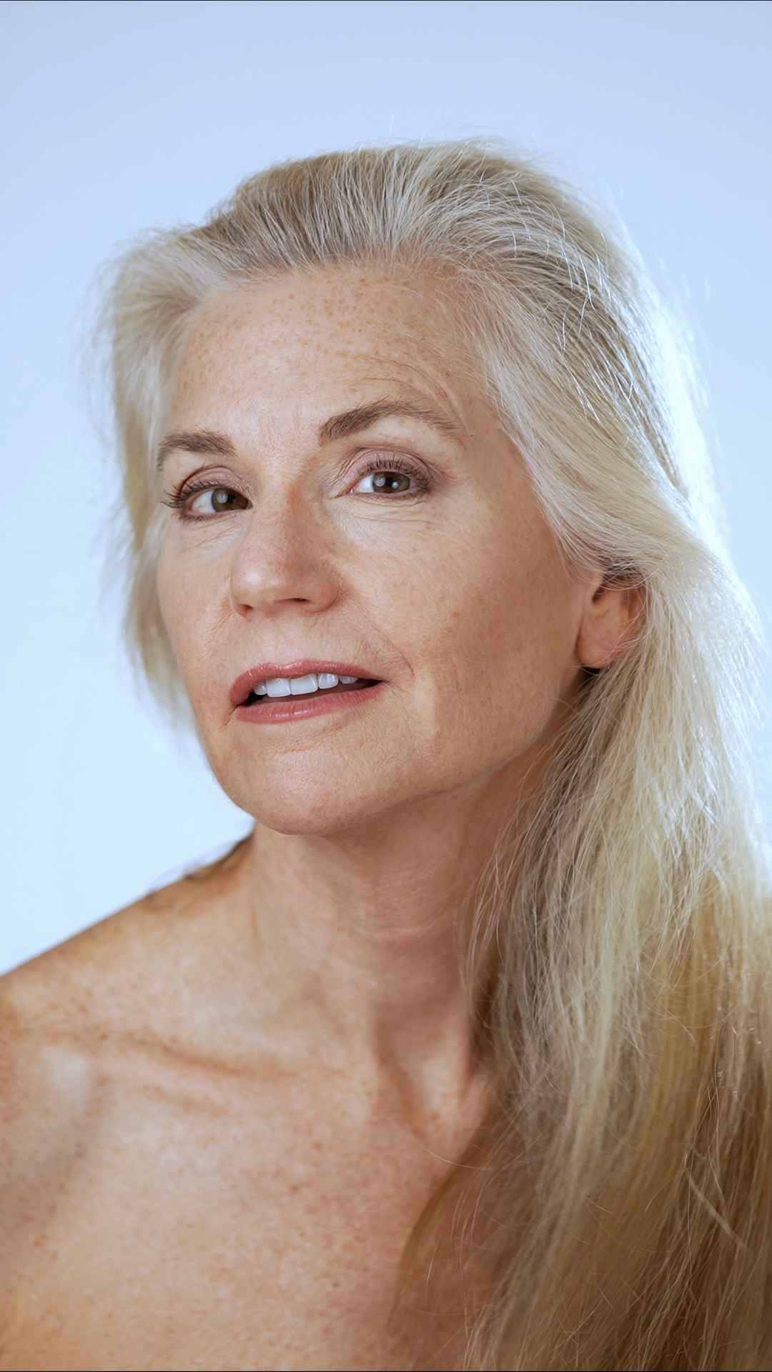 Vertical Video Portrait Of Playful Flirting Happy 50s 60s Middle Aged Woman With Blond Gray Flipping Hair Around Old Healthy Skin Care Spa Beauty Concept Skincare Treatment Anti Age Cosmetics Slow MotionÂ
