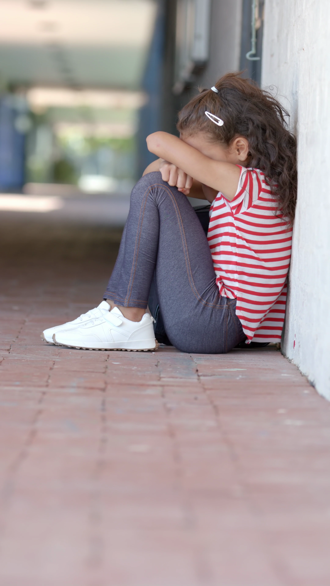 Vertical Video Sitting Alone Child In Striped Shirt Leaning Against Wall Feeling Sad At SchoolÂ
