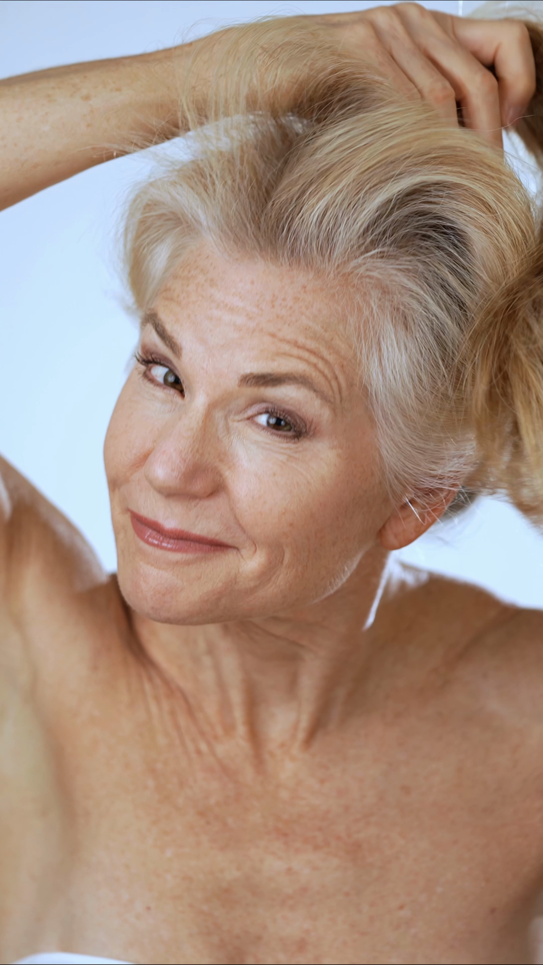 Vertical Video Slow Motion Portrait Of Happy 50s 60s Mature Woman With Pretty Blond Gray Hair Old Healthy Skin Care Spa Beauty Concept Isolated On White BackgroundÂ