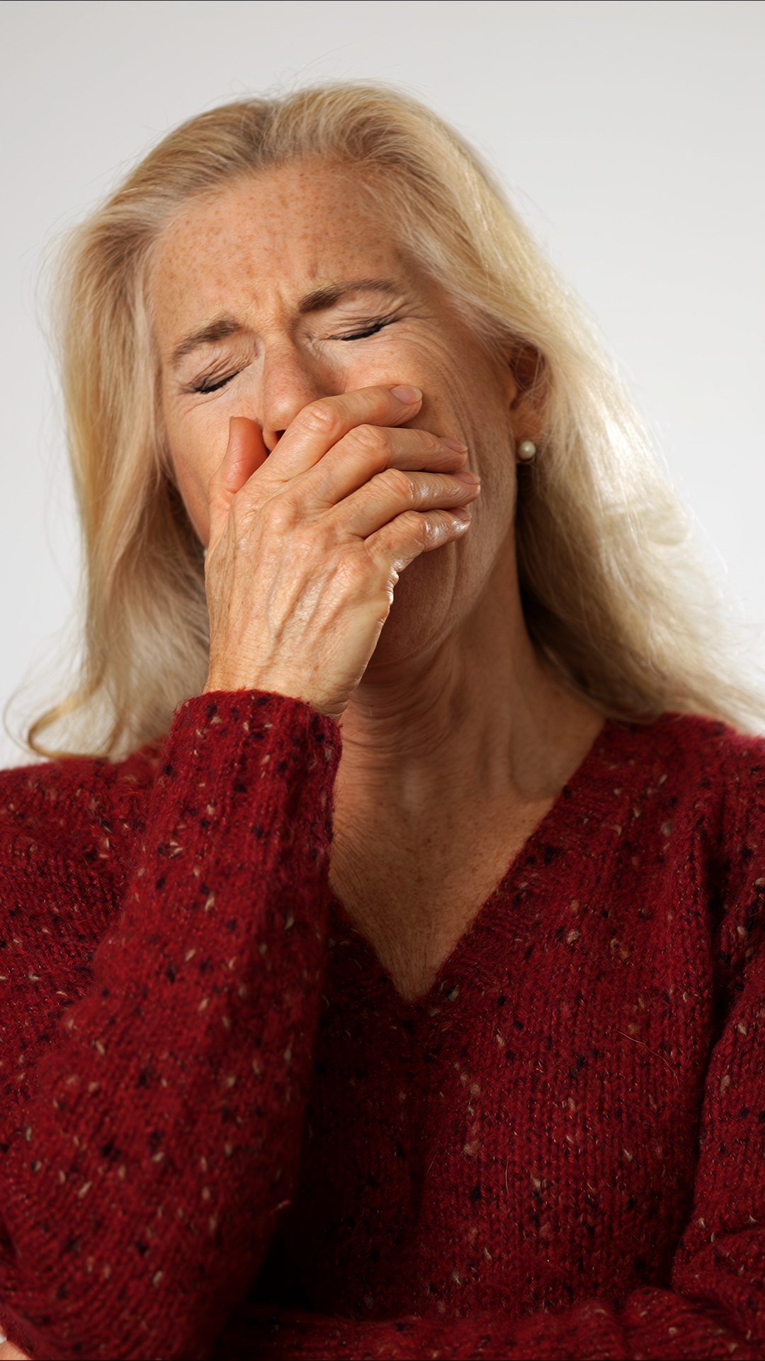 Vertical Video Tired Exhausted Pretty Attractive Mature Blond Woman In Red Sweater Portrait Isolated On Solid White Background With Copy SpaceÂ