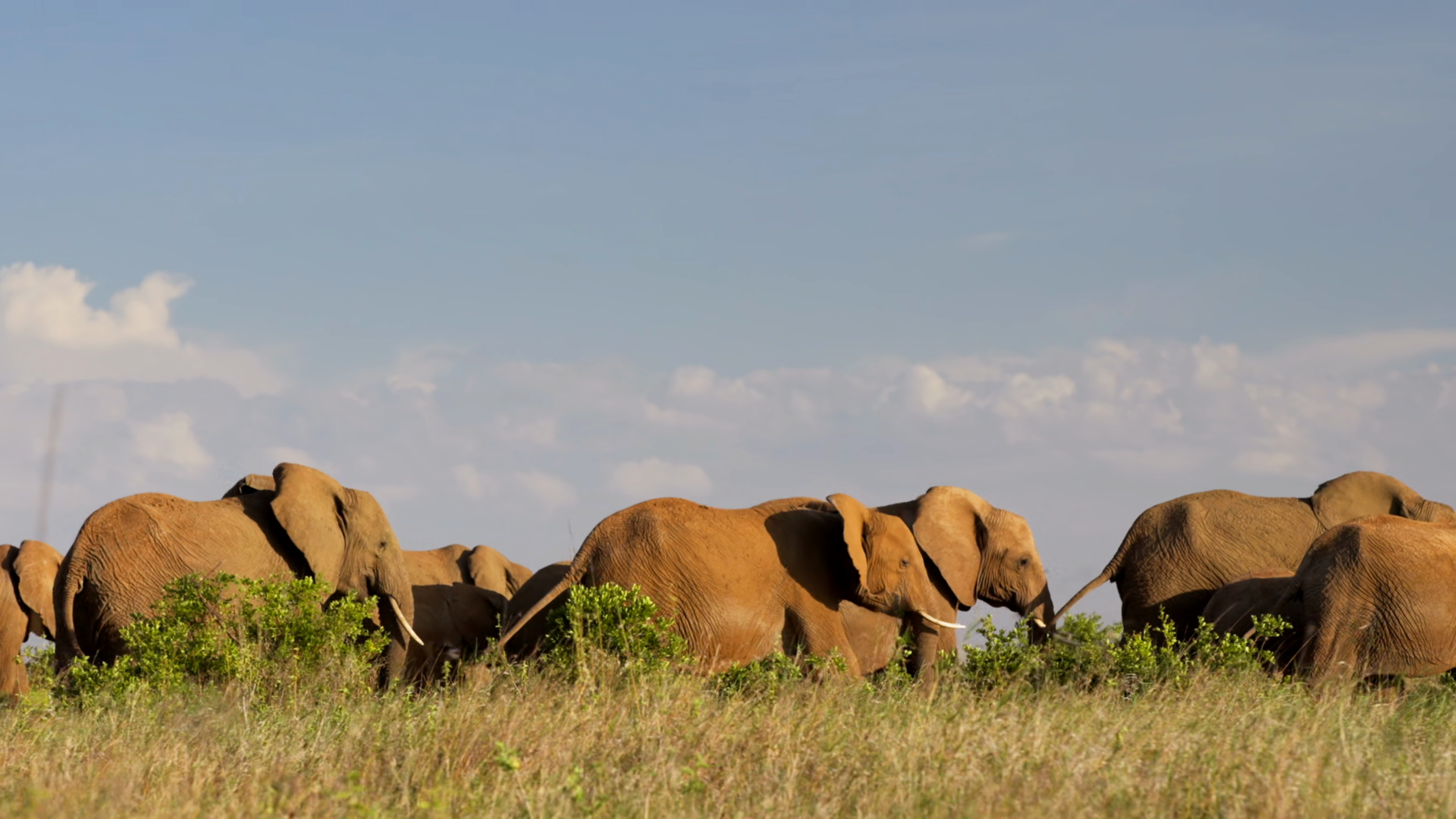 Very Wide Gimbal Tracking Of Herd Of African Elephants Loxodonta Africana Moving With Bird In Savannah In Sunny Day In KenyaÂ