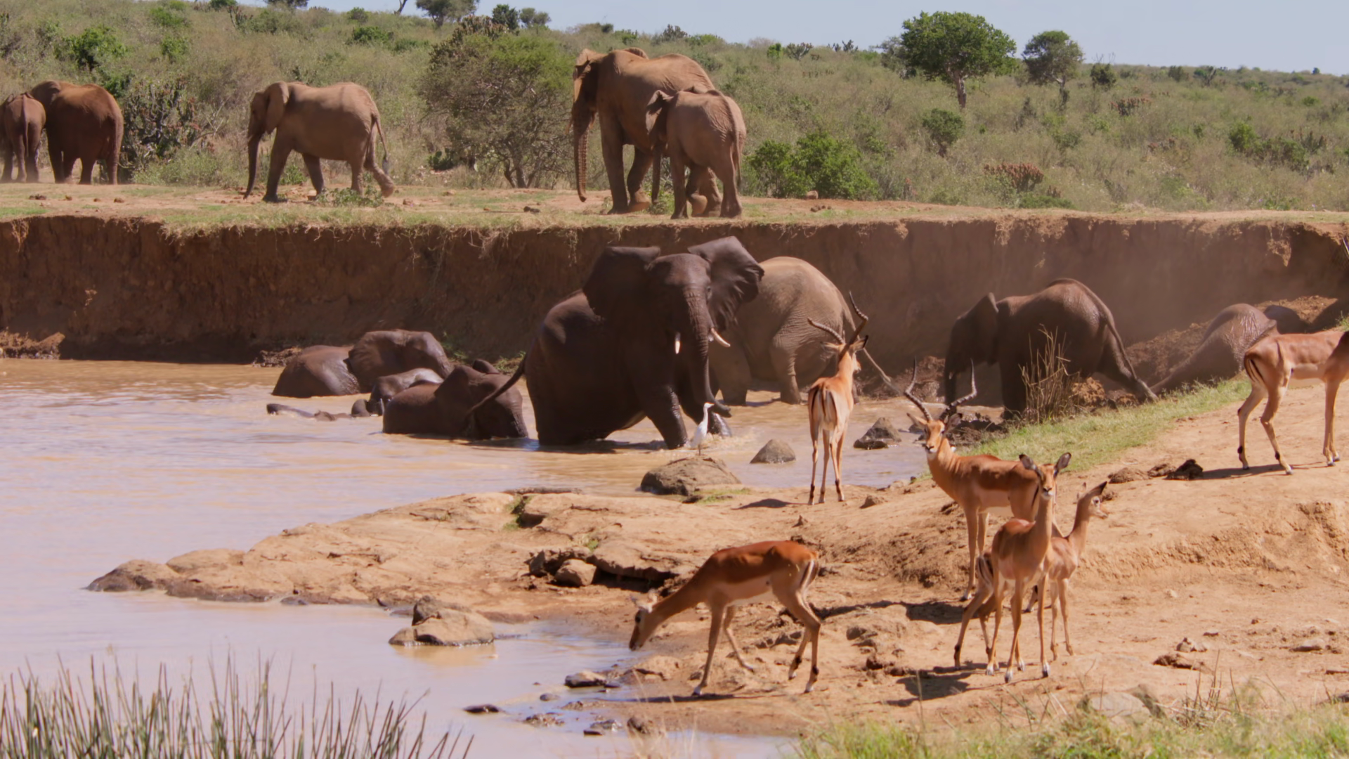 Very Wide Of A Herd Of African Bush Elephants Loxodonta Africana Drinking From A Waterhole In The Savannah At Midday In KenyaÂ