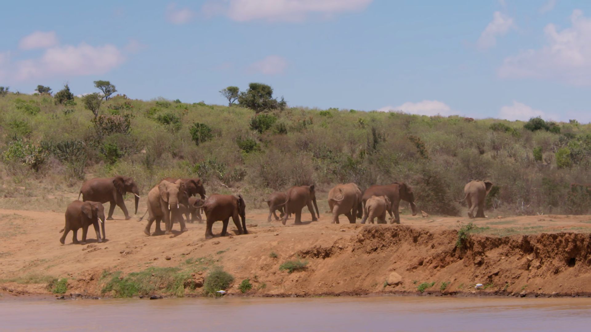 Very Wide Of A Herd Of African Bush Elephants Loxodonta Africana Walking Out Of A Waterhole In Savannah In The Afternoon In KenyaÂ