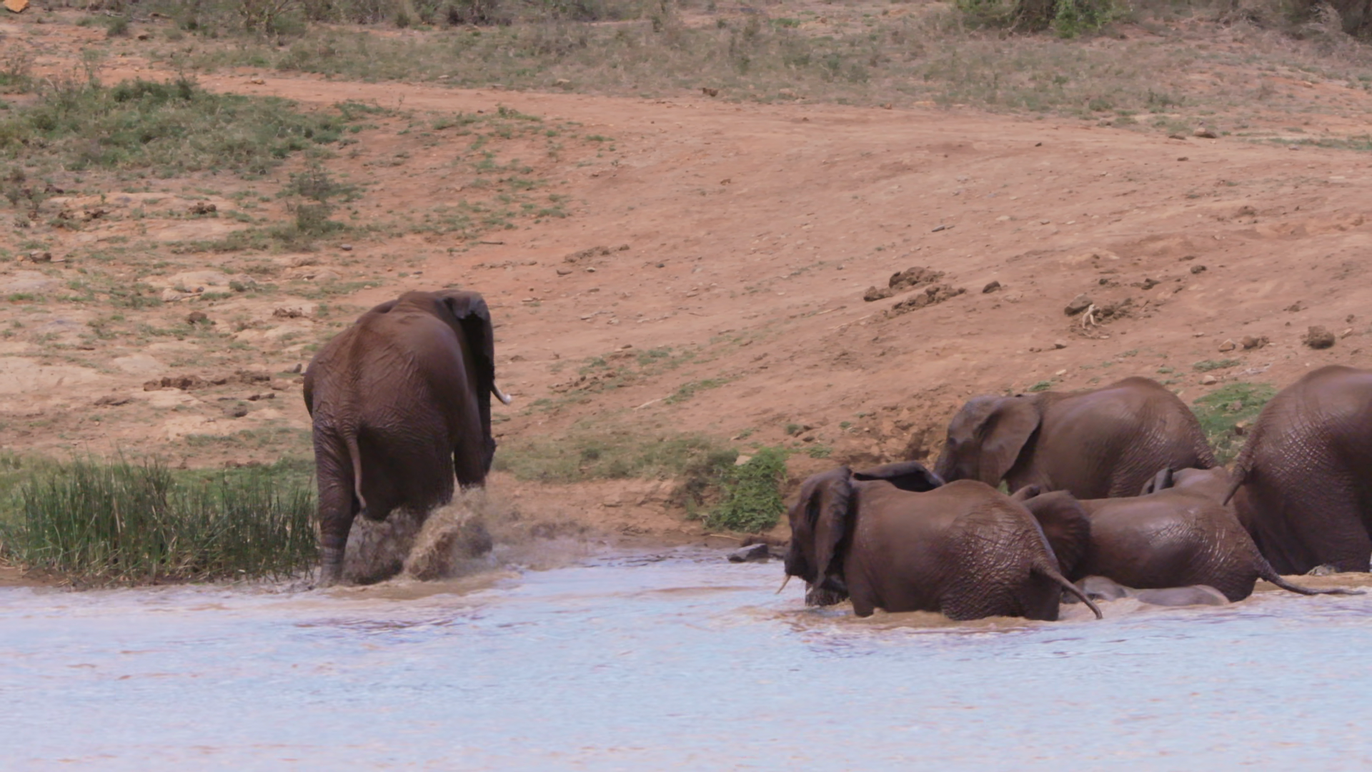 Very Wide Of An African Bush Elephant Loxodonta Africana Walking Out Of A Waterhole In Savannah In The Afternoon In KenyaÂ