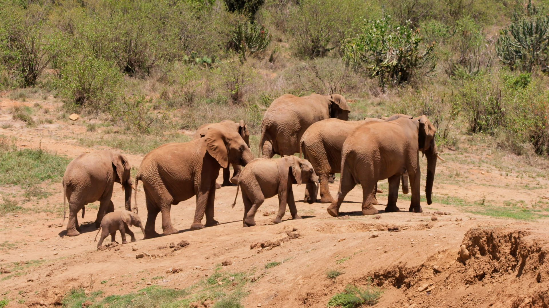 Very Wide Pan Of A Herd Of African Bush Elephants Loxodonta Africana Walking From A Waterhole In The Savannah Grasslands At Midday In KenyaÂ