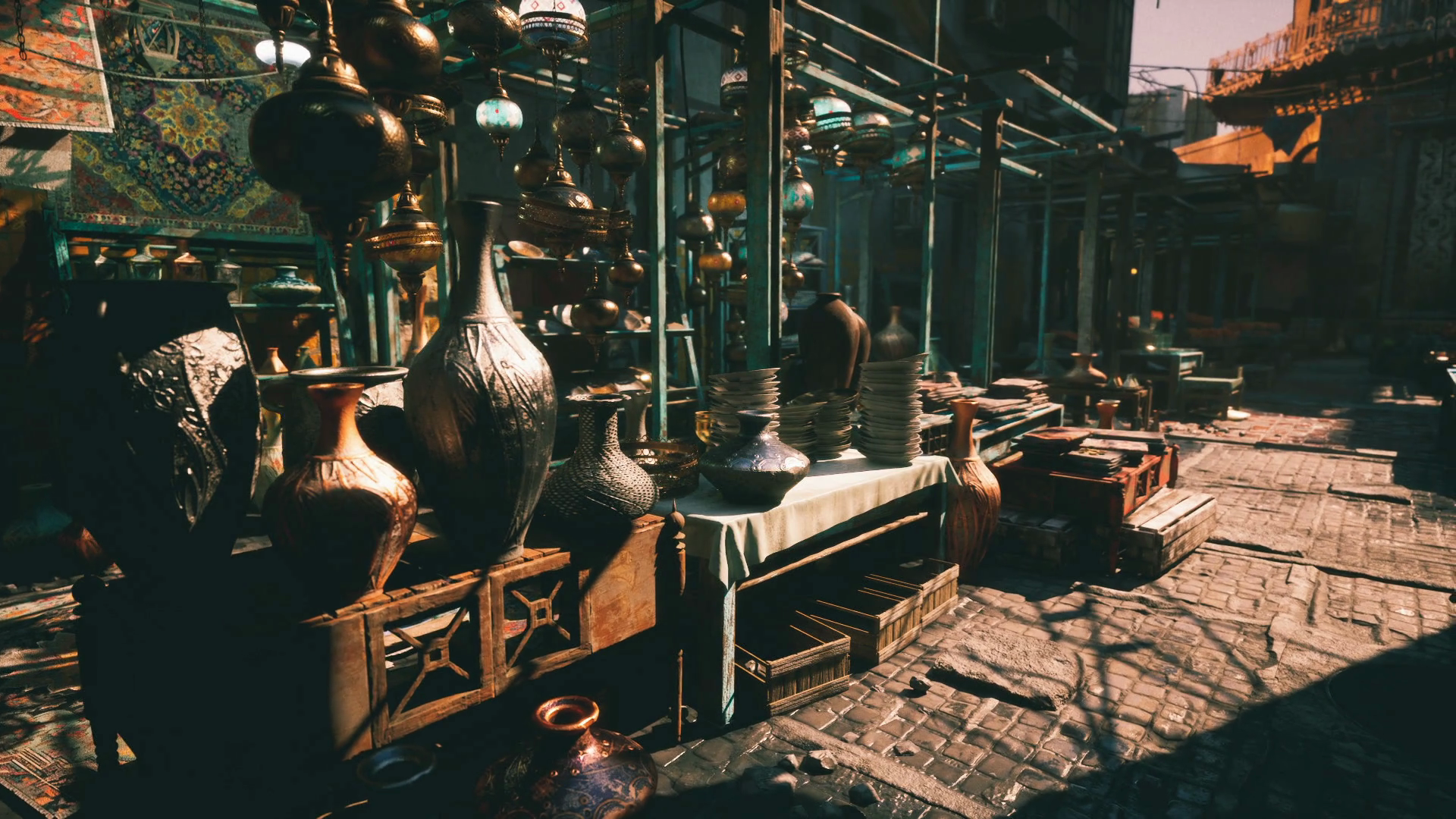 Vibrant Market Filled With Antique Pottery And Artisan Crafts In Sunlight