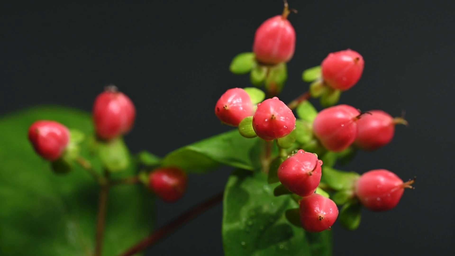 Vibrant Red Hypericum Berries With Water Droplets On Dark Background 4k FootageÂ