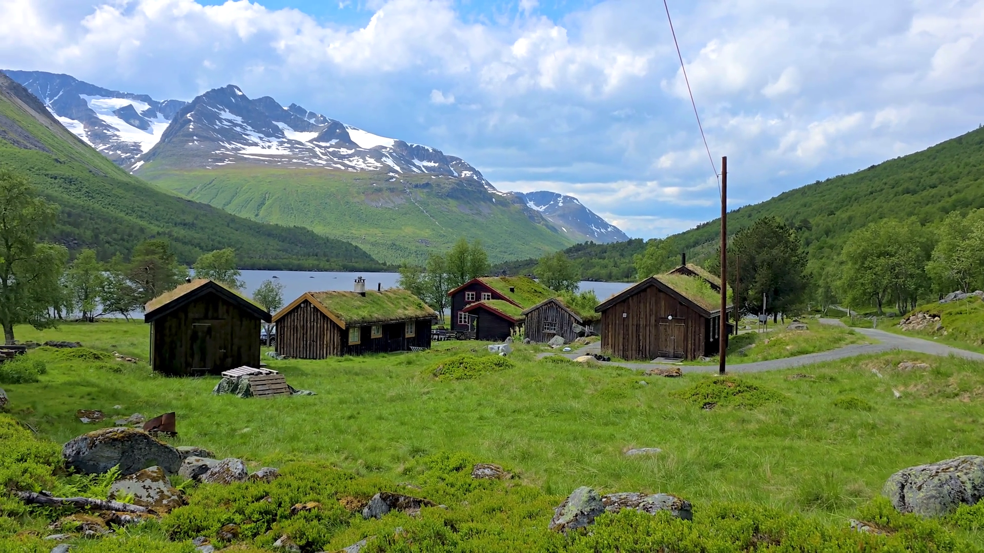 Video Of Serene Village Nestled In The Mountains With A Lake Lush Greenery Green Roofs And Towering Snowcapped Mountains Creating A Tranquil SettingÂ