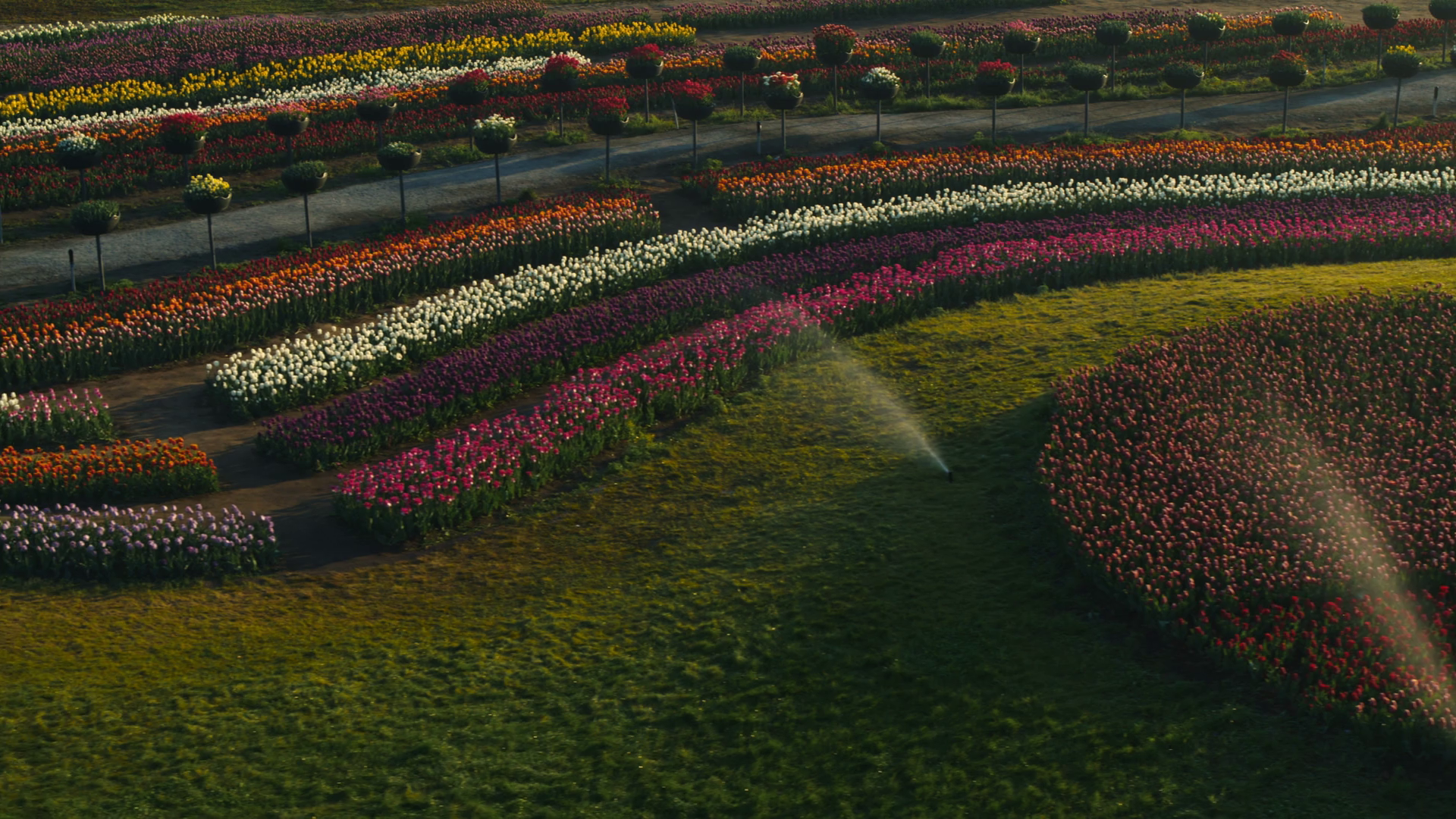 View Of Flower Valley With Irrigation System In Sunrise Light Old Retro Car Staying In Spring Blooming Park In Sunset Lights Watering Of Green Hill In Bloom Early Morning Evening In Flower GardenÂ