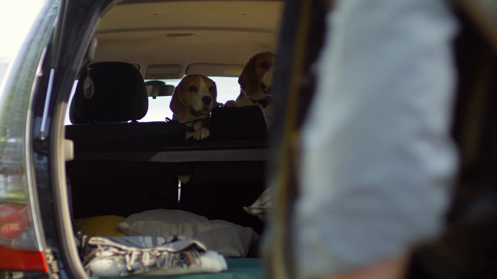View Of Two Cute Beagle Dogs In Car Watching Owners Pack Before RideÂ