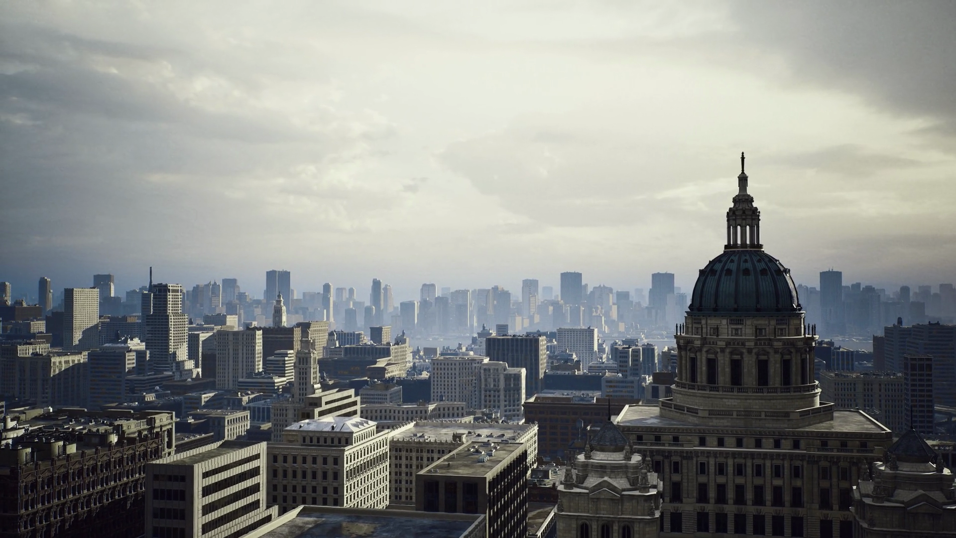 Vintage Style City View With Overcast Weather And Distant Skyscrapers