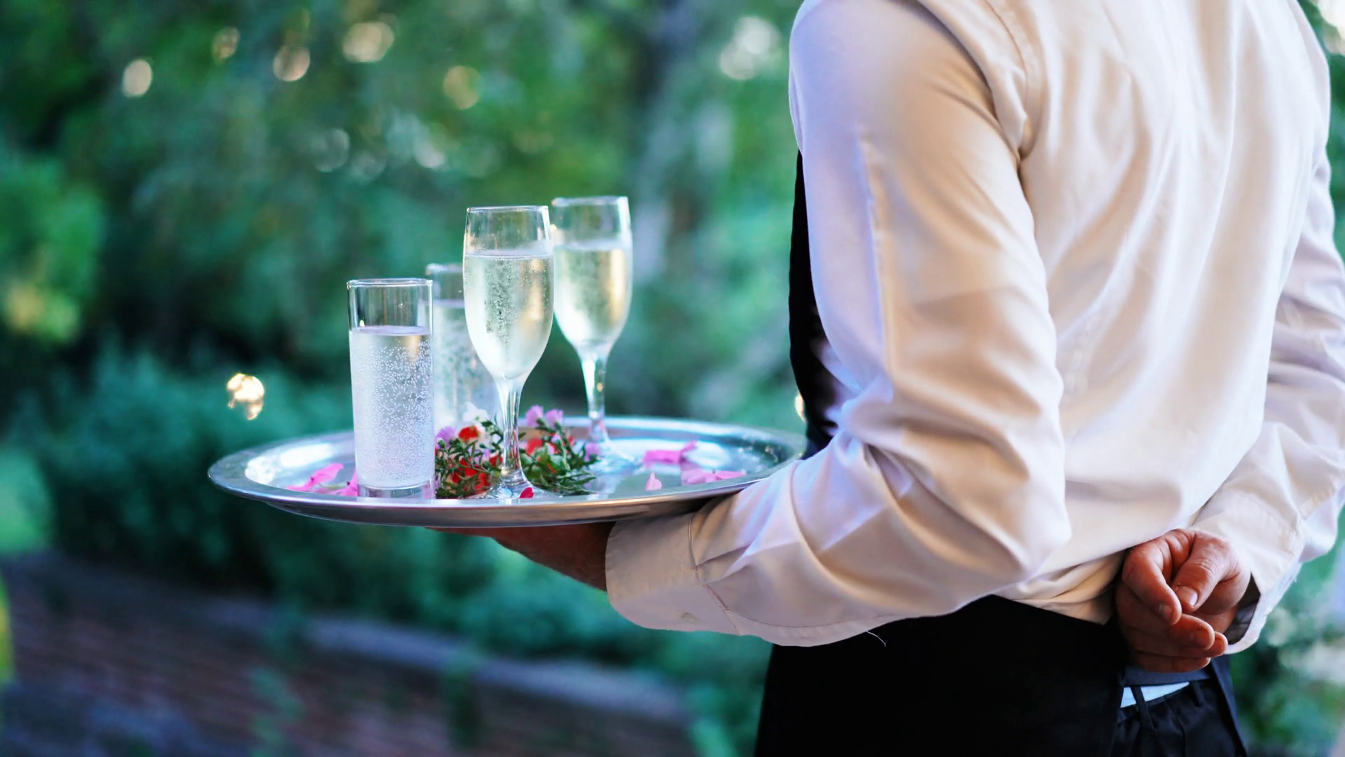 Waiter And Champagne Glasses On A Tray In Luxury Restaurant Catering Service 4kÂ