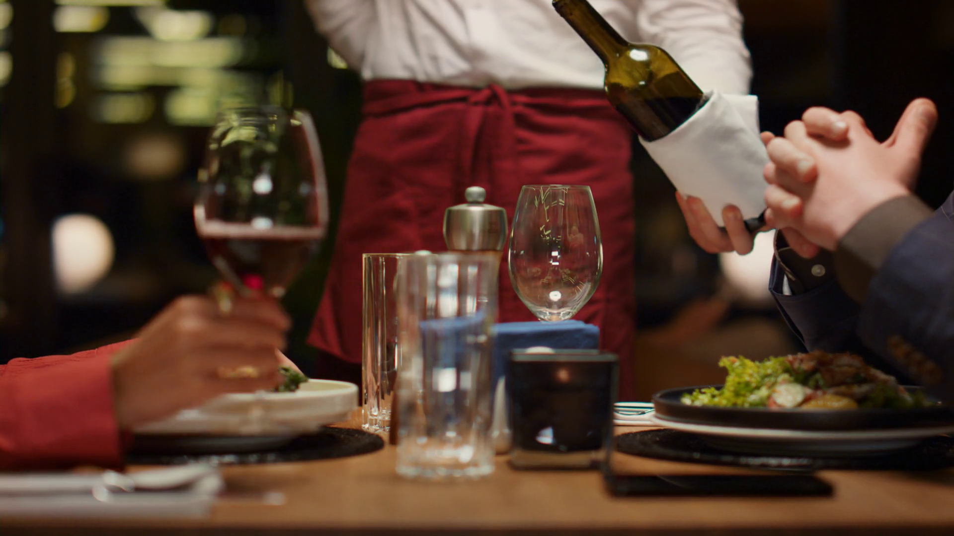 Waiter Pouring Wine Glass At Stylish Loft Restaurant Table Unknown Couple Enjoying Fancy Eating Place Close Up Two Romantic Partners Tasting Alcohol On Degustation Fine Dining Leisure ConceptÂ
