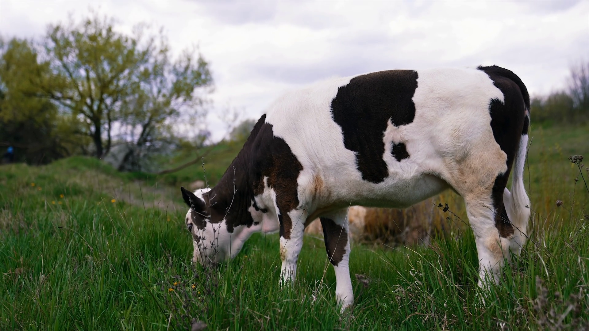 White And Black Calf Eating Grass On Pasture Amazing Small Cow Grazing On The Beautiful Green MeadowÂ