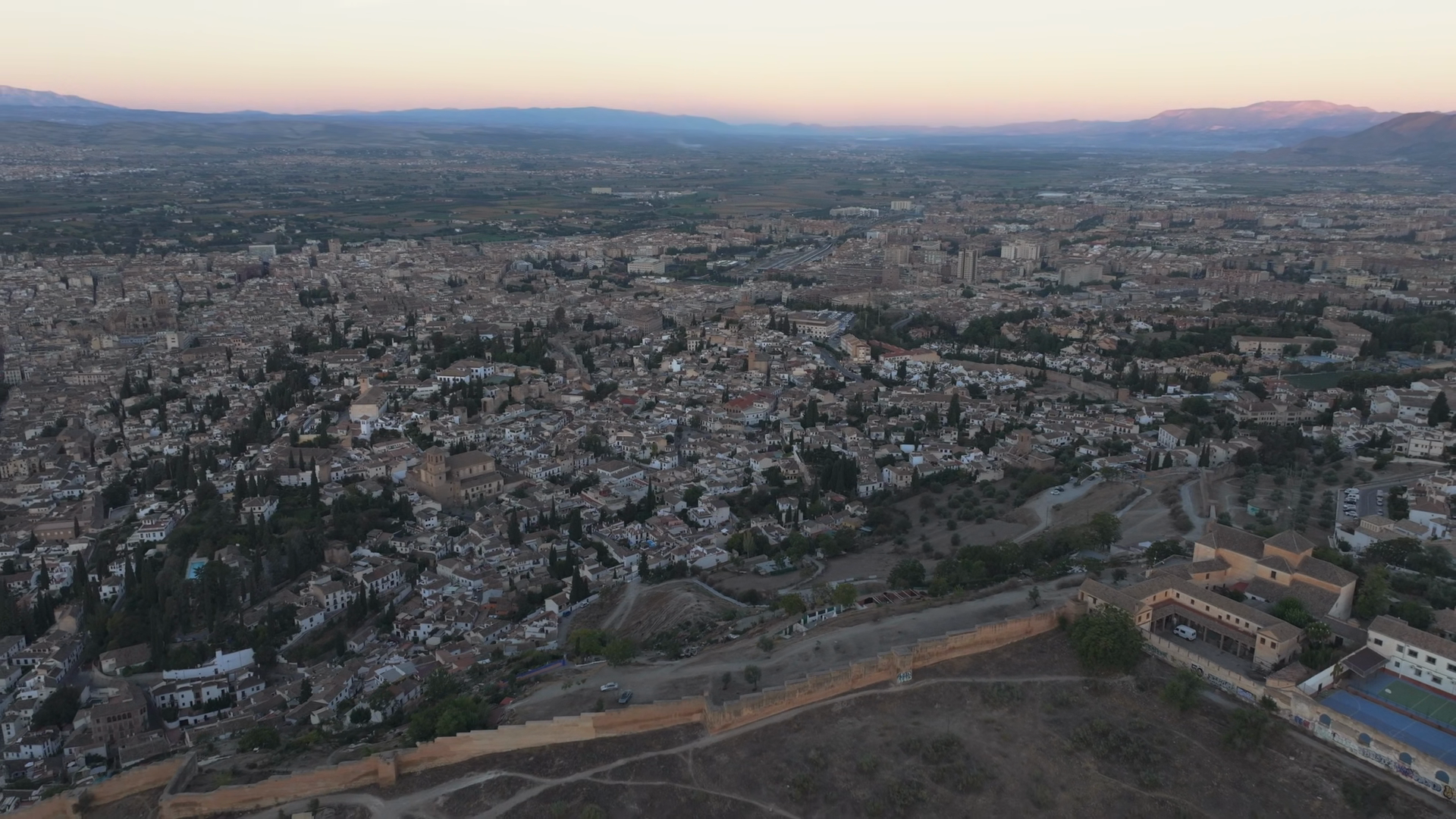Wide Aerial Drone View Across Granada At Sunrise Soft Autumn Light Over Dense City Blocks From The Foothills Near The Alhambra Andalusia SpainÂ