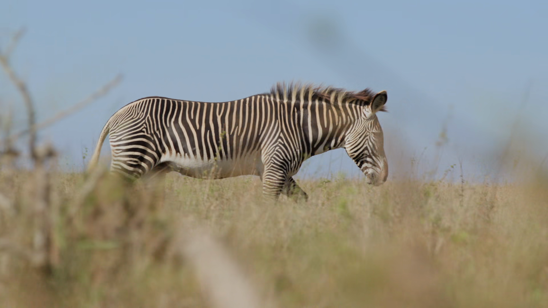 Wide Dolly Tracking Of A Male Plains Zebra Equus Quagga Walking Through Tall Dry Grass In The Savannah In The Evening In KenyaÂ