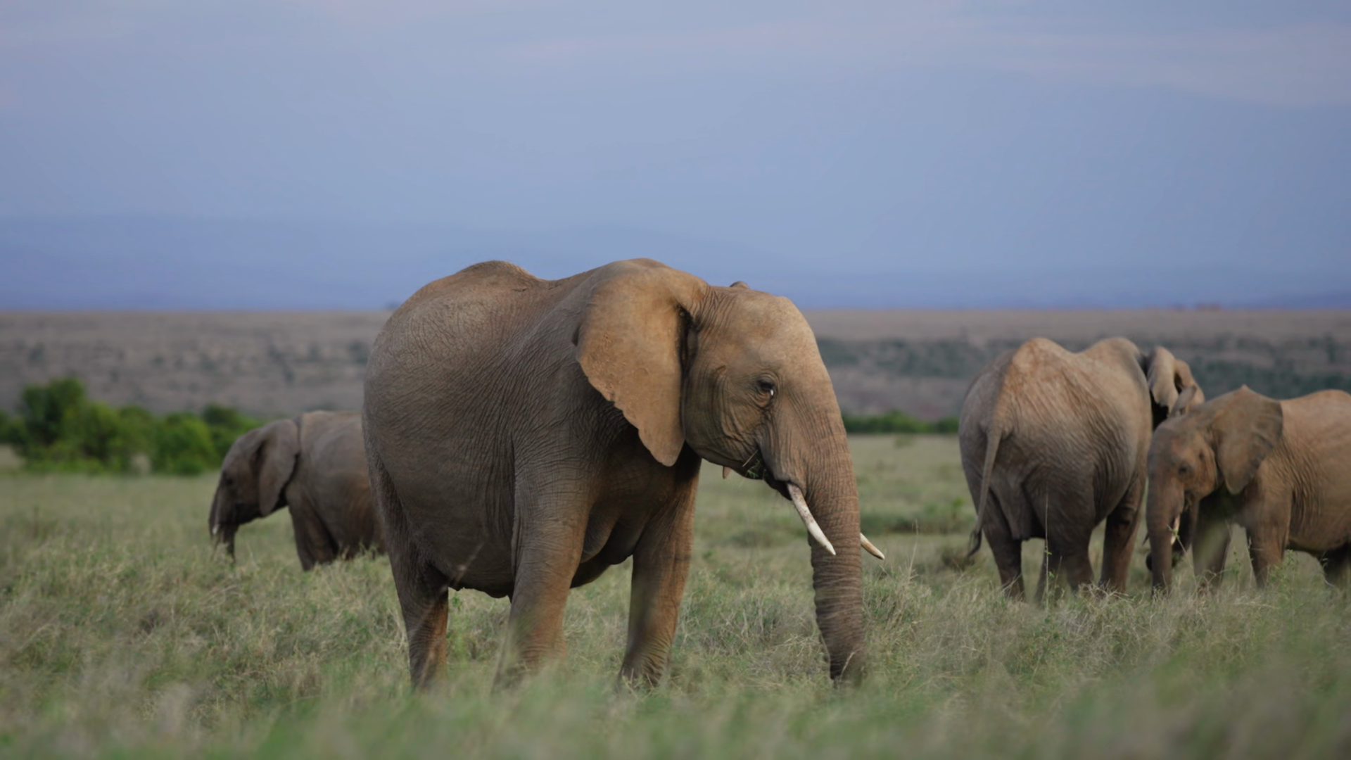 Wide Gimbal Parallax Of African Bush Elephants Loxodonta Africana Grazing On Tall Green Grass At Daybreak In KenyaÂ