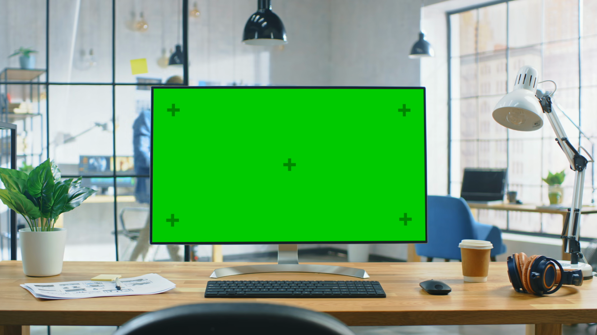 Wide Green Mockup Screen Desktop Computer Standing On The Desk In The Modern Creative Office In The Background Bright Creative Loft For Developers And Designers Where Professional WorkingÂ