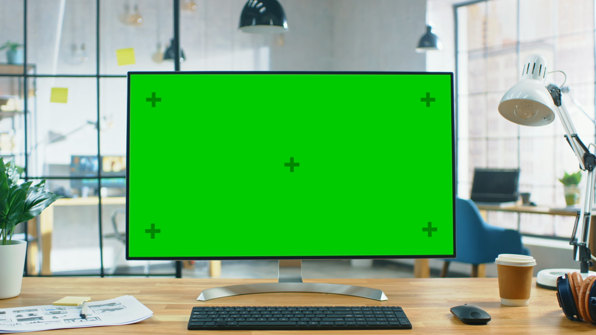 Wide Green Mockup Screen Desktop Computer Standing On The Desk In The Modern Creative Office In The Background High Ceiling Bright Creative Loft For Professional Developers And DesignersÂ