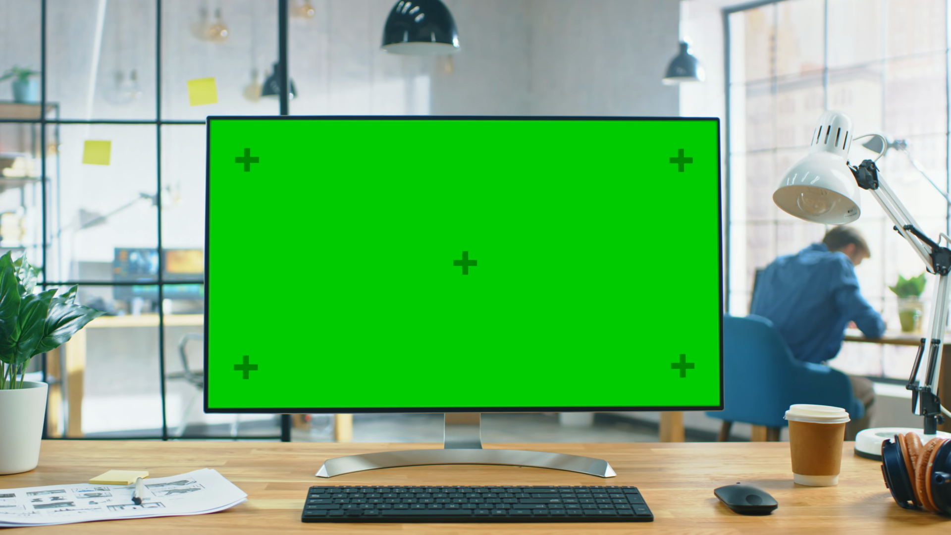 Wide Green Mockup Screen Desktop Computer Standing On The Desk In The Modern Creative Office In The Background High Ceiling Creative Loft For Developers And Designers Where Professional Working At His DeskÂ