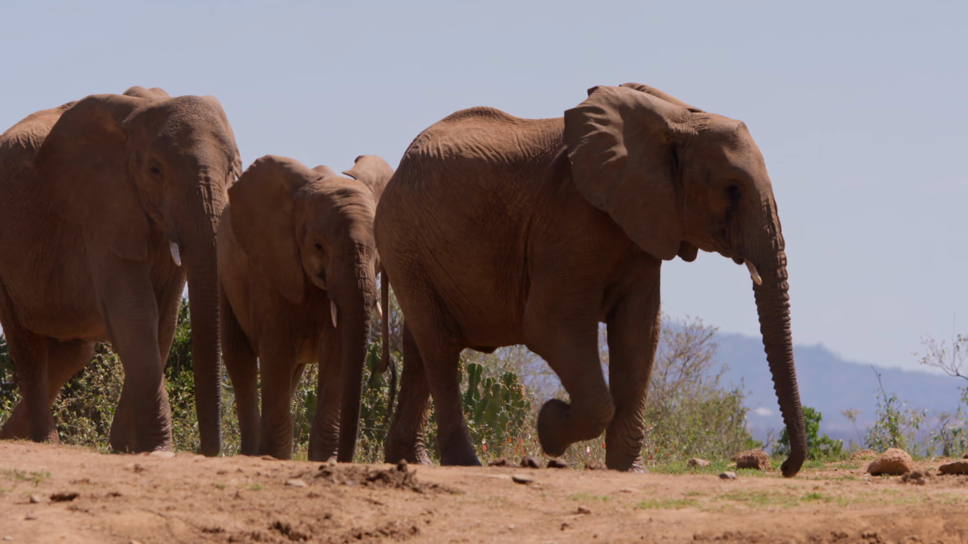Wide Pan Of A Herd Of African Bush Elephants Loxodonta Africana Walking Through The Savannah Grassland At Midday In KenyaÂ